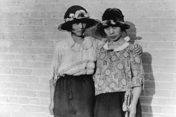| description | The image shows an unidentified woman, the leftmost woman, in a dark coloured hat decorated with flowers and a light coloured blouse tucked into a dark coloured skirt standing with her left arm around another unidentified woman in a dark coloured hat and patterned blouse partially tucked into a dark coloured skirt. Directly behind them is an exterior brick wall. |