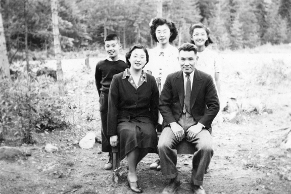 | description | This image shows a woman and a man sitting on a wood bench. Standing behind them are two girls and one boy. Behind them is a forest. The woman and man are Kana and Sumiye Watanabe, respectively. Their children shown from left to right are Seiichi, Keiko, and Junko "June" Watanabe. |