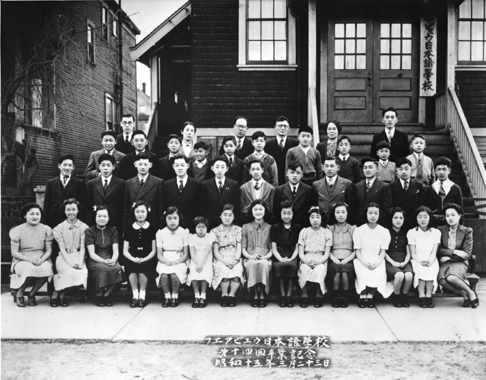A translation of the caption near the bottom of the photo reads, "Fairview Japanese Language School March 23, 1940 14th Annual Graduation". The translated text on the banner reads, "Fairview Japanese Language School".