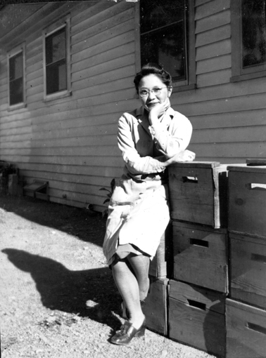 | description | The image shows a woman leaning in a relaxed pose on three stacks of boxes in front of a wooden building. The woman is unidentified. She appears to be casually leaning on the boxes with legs crossed, one under the other. Her left elbow leans on her right hand on the surface of the box in order to give an overall, natural and balanced posture. Her face relaxes on her left palm as she smiles to the camera. She wears round rimmed glasses, long sleeved dress, and dress shoes. The photo furthermore shows four windows installed across the wooden building in the background. |