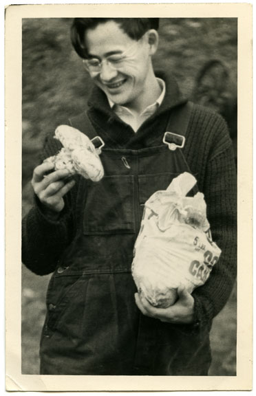 | description | The item consists of a black and white photograph. The image shows Thomas Shoyama holding a large mushroom in his right hand and a bag in his left. He is looking down at the mushroom and smiling. Two handwritten notes in blue ink are on the back of the image. A note in the upper right corner reads: "Sam Okamoto 333 Guildford St. Wpg. Man. R3J 2J6", beneath this note in a different handwritten a note reads: "Tom 1938 picking mushrooms on Malahat". |