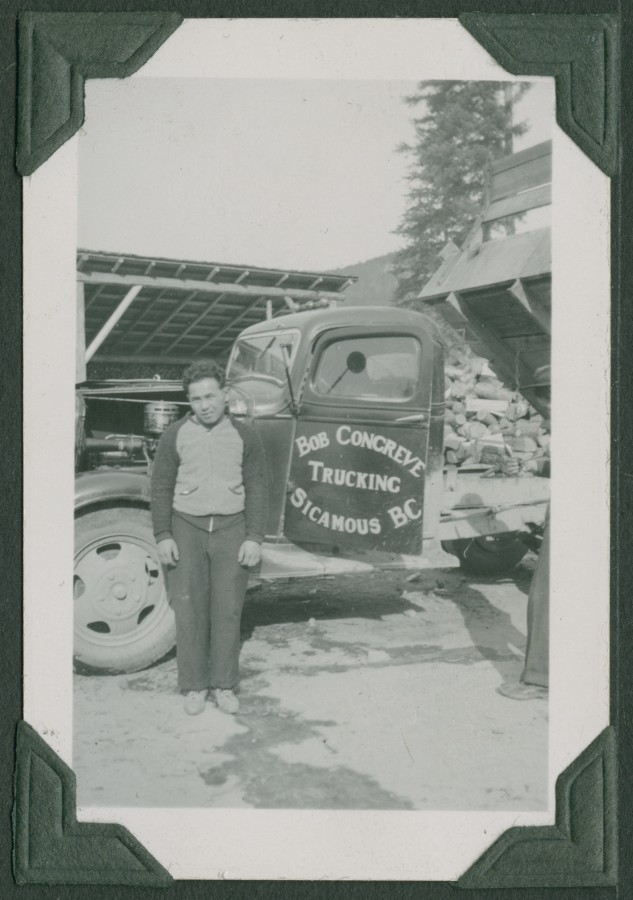Black & white outdoor photograph of Japanese Canadian man wearing work clothes, standing in front of a truck with “Bob Concreve Trucking Sicamous, BC” painted on door. [Location is likely Solsqua labour camp, BC]