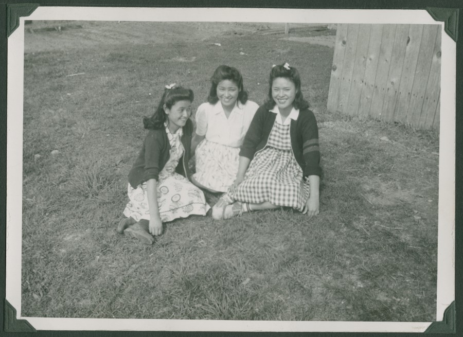 Black & white outdoor photograph of three Japanese Canadian women; Aya Fujioka (centre) and two unidentified, wearing sweaters and dresses, sitting on grass with wood fence to left.