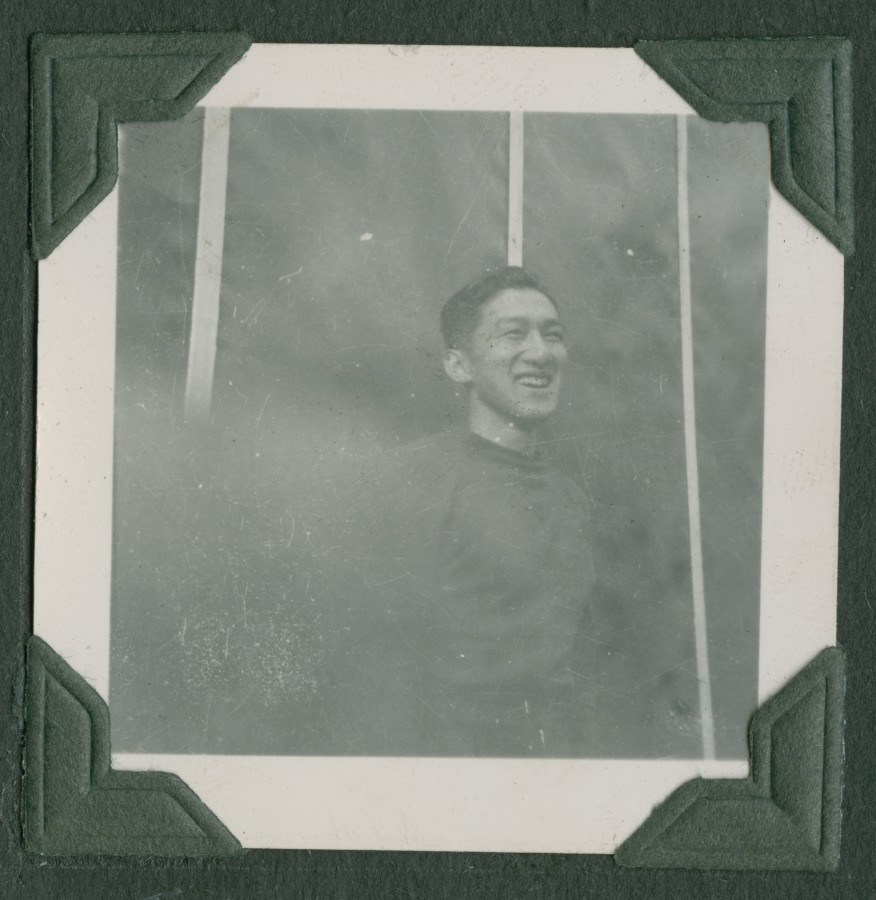 | description | Black & white outdoor photograph of young Japanese Canadian man smiling, wearing sweater. |