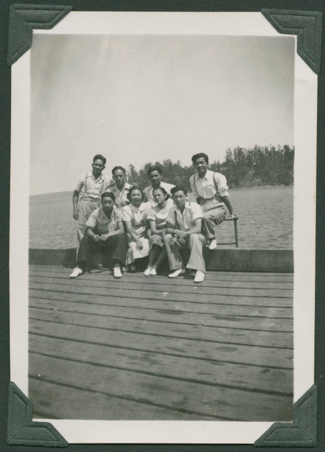 Black & white outdoor photograph of eight young Japanese Canadians in Chemainus, BC wearing white shirts and blouses. Men are wearing suspenders and pants. Women are wearing skirts. Group is seated on wood dock with lake in background.