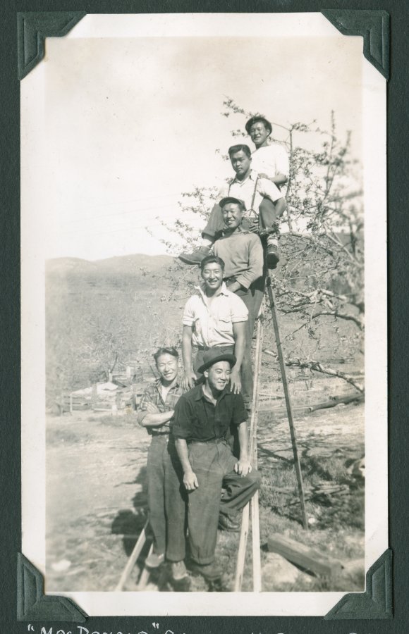 | description | Sepia toned outdoor photograph of the "MacDonald Gang" in Vernon, BC. Pictured are six Japanese Canadians standing on a wood ladder with a mountain valley in the background. |