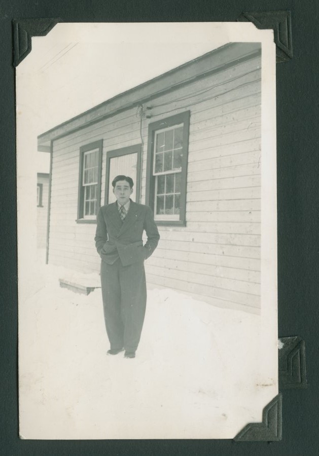 Black & white outdoor photograph of unidentified Japanese Canadian wearing full suit and jacket with neck tie, standing in the snow, in front of a wood house, with hands in pockets.