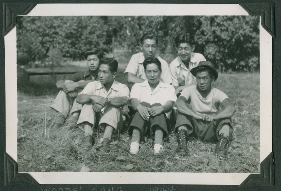 | description | Black & white outdoor photograph of six unidentified young Japanese Canadians sitting in a grassy field with trees in the background. They are dressed casually, in collared shirts, T-shirts, sweaters, pants, sneakers or lace up boots. One person is wearing a hat. Photograph is captioned in album with "Woods' Gang 1944". |