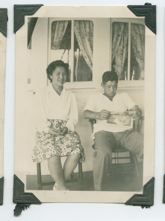 | description | Sepia toned outdoor photograph of two unidentified Japanese Canadians sitting in wood chairs, outside a wood house, with two windows above them. The person on the left is wearing a long sleeved, light coloured, collared blouse, and a floral patterned, knee length skirt. The person on the right is reading a newspaper that he is holding in his hands, wearing a short sleeved, light coloured shirt, and mid tone pants. |