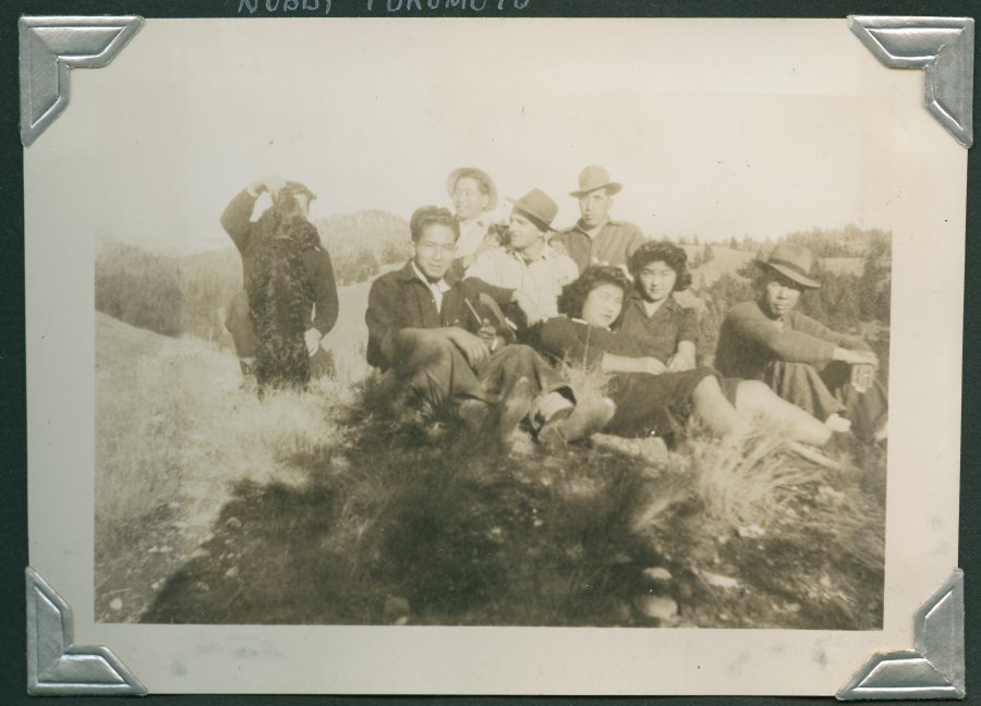 descriptionSepia toned outdoor photograph of a group of eight people seated on a grassy hillside in Keremeos, BC, with tree covered hills in the background. They are dressed in casual clothing; four are wearing hats. Tommy Sawayama is pictured at front centre, second from the left, wearing a dark collared jacket.