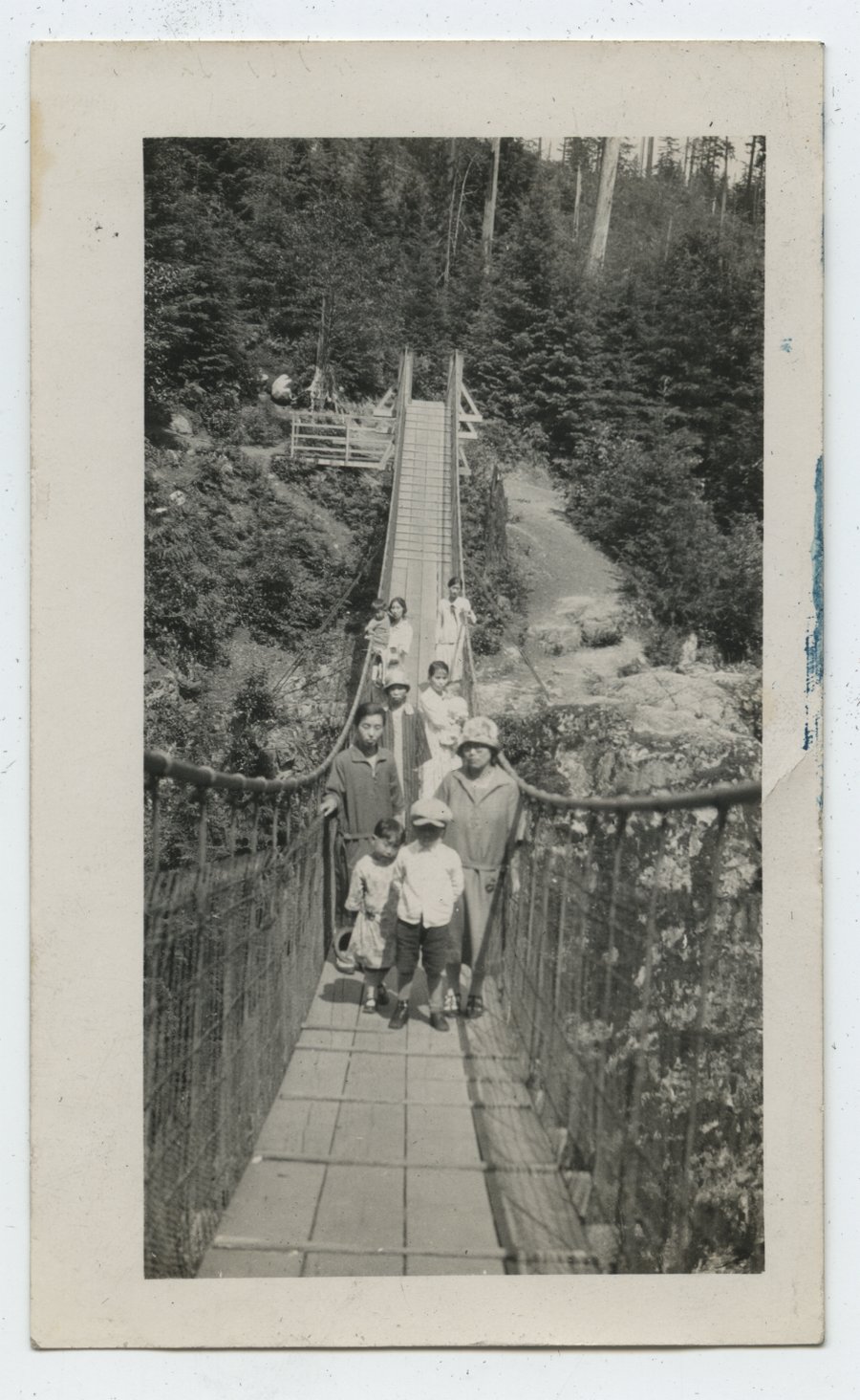 | title | Group of ten people on suspension bridge; unknown location, [BC]; [ca.1925] |