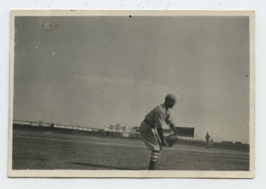 | description | Black & white outdoor photograph of five baseball players in playing field wearing team uniforms. The figure in the foreground is gesturing as though they have just caught a baseball thrown to them by a figure in the distance. A scoreboard and billboard advertisements are also visible in background. |