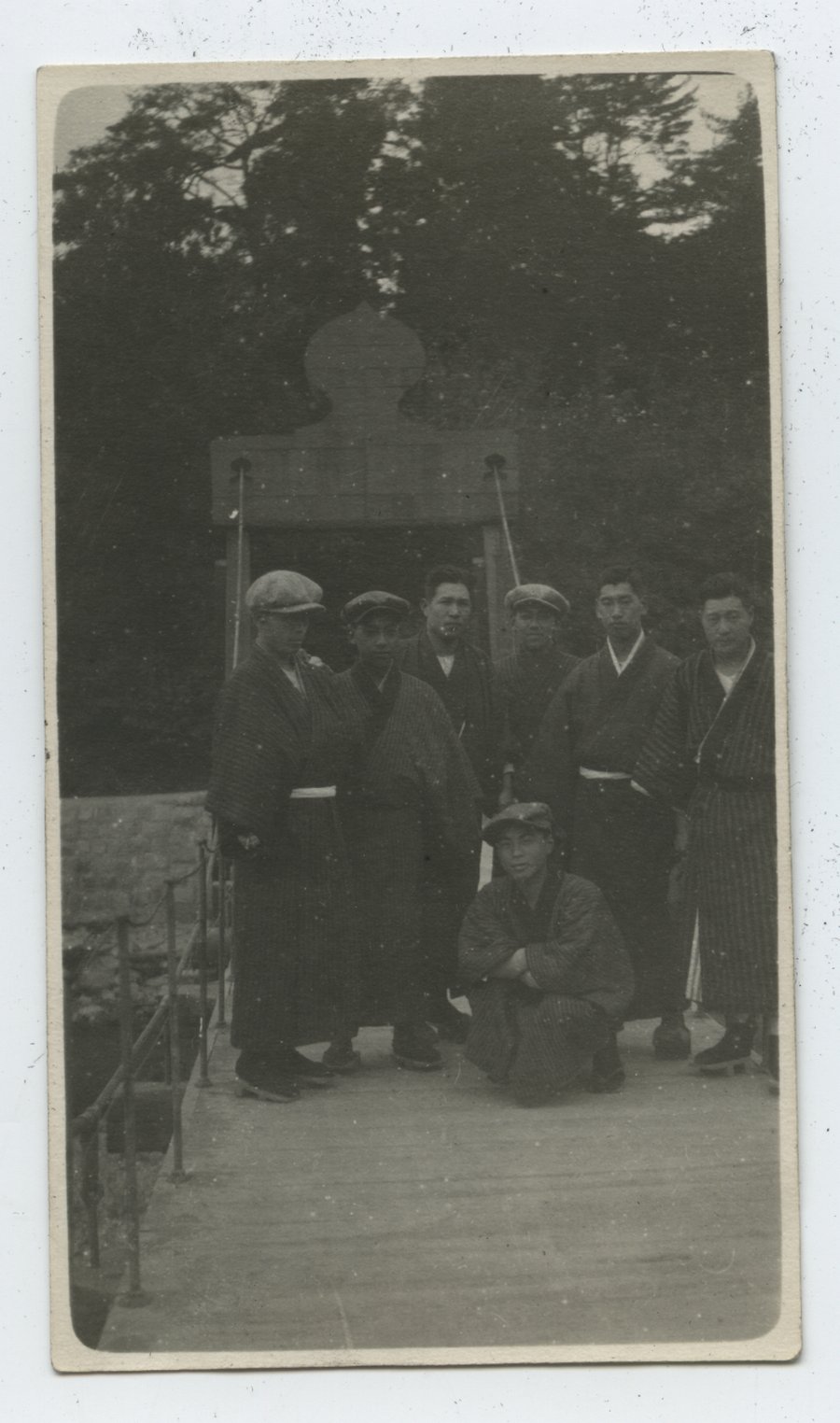 | description | Black & white outdoor photograph of seven unidentified Japanese Canadians wearing floor length robes [yukata] and geta footwear; four are wearing hats, six are standing and one is crouched down in front, on a wood and rope bridge with decorative wood gateway, stone wall, and forest behind them. |