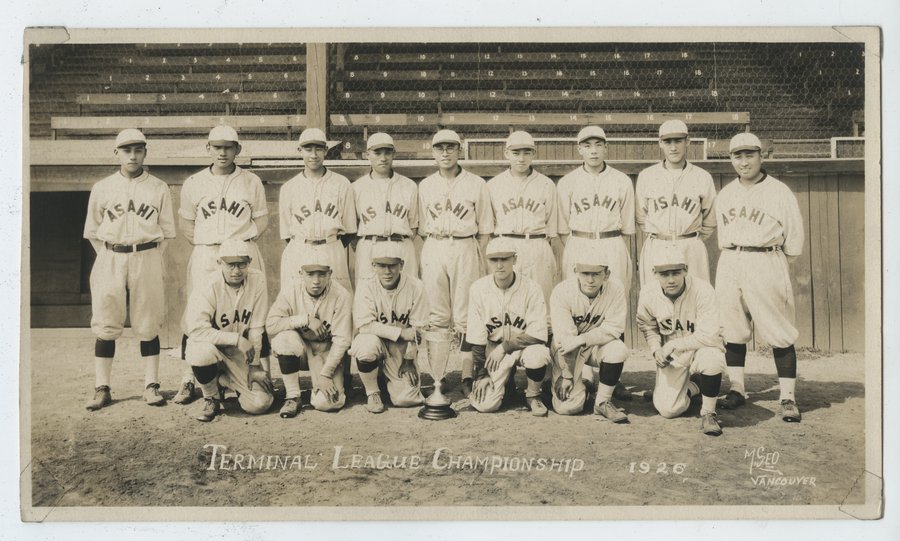 | description | Sepia toned outdoor group photograph of fifteen members of the Asahi baseball team at the Terminal League Championships at Athletic Park in Vancouver, BC, on August 8, 1926. Everyone is wearing Asahi baseball team uniforms with caps. Six players in the front row are kneeling with a large trophy at their centre while the other nine stand behind them. A wire fence and wood bleachers fill the background. Recto of photograph contains white text that reads "Terminal League Championship; 1926; M.SEO Vancouver".