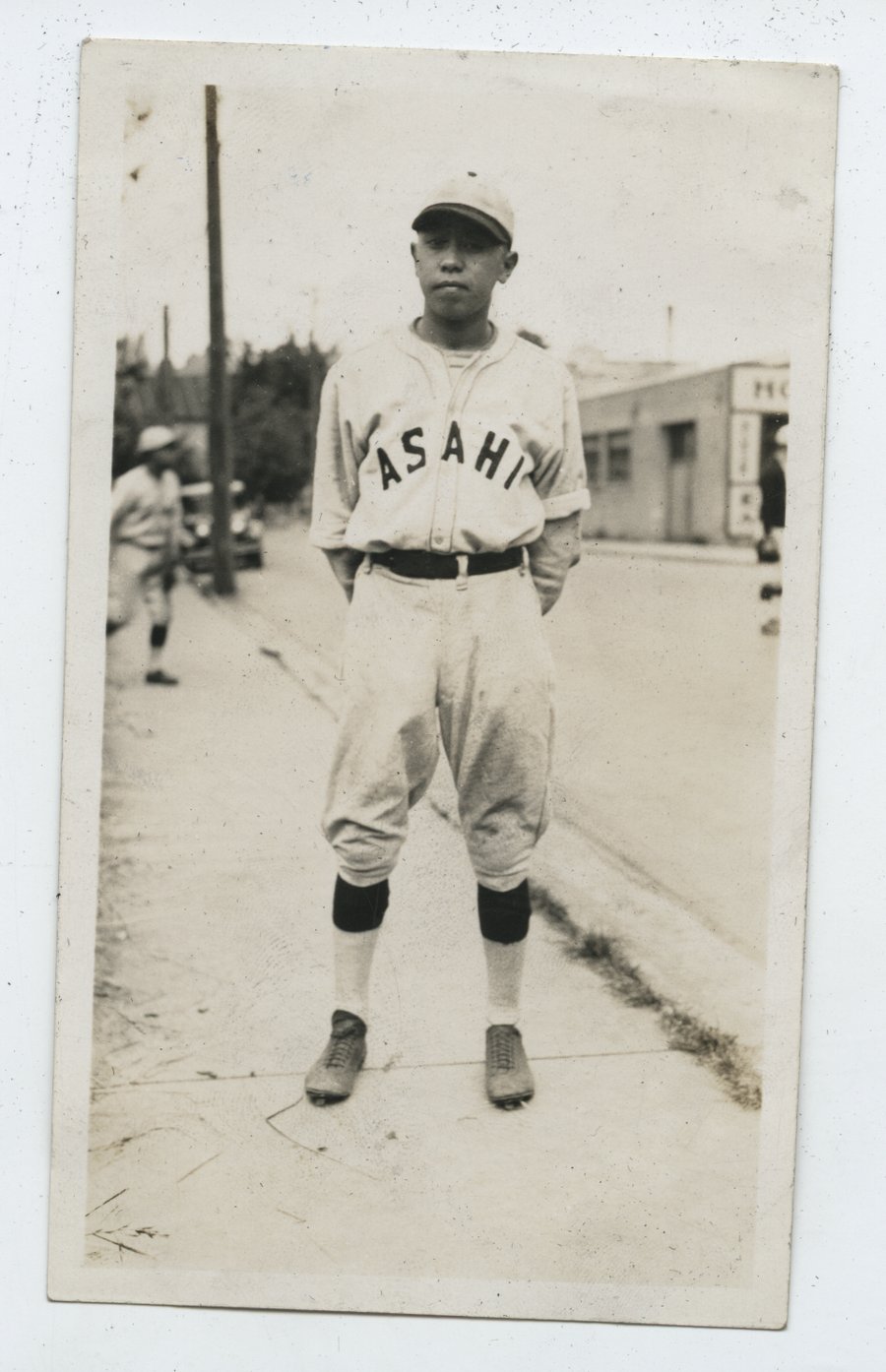 Black & white outdoor photograph of unidentified Asahi baseball team member wearing full players uniform, standing on a sidewalk with commercial street in background.