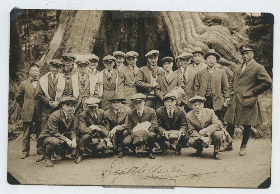 | description | Sepia toned outdoor photograph of twenty Japanese Americans wearing formal dress, including full suit and tie, dress caps, and three with sweaters wrapped around their shoulders. One man to the right is wearing a knee length coat. The group is standing in front of the Stanley Park Hollow Tree. Fourteen people are standing and six are crouching in front of them. Recto is annotated with "Seattle Asahi; 1919".