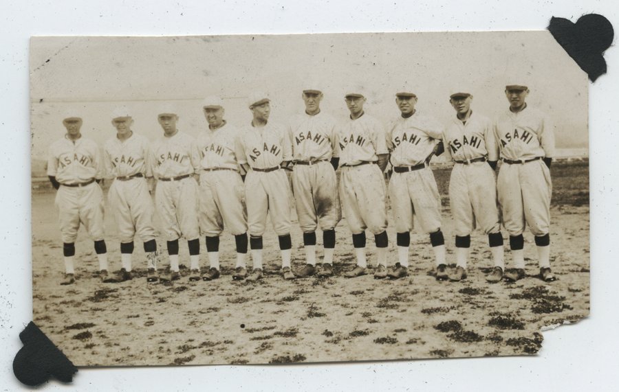 | description | Sepia toned photo of ten Asahi baseball team players standing in a row with arms behind backs, on a sports playing field, wearing Asahi team uniforms, including caps. One player (fifth from right) has a large dirt stain on their left knee. Verso of photograph is annotated in black pen with "...training; Hastings Park; 1926" and reveals that the original item has been cropped. Album page is annotated in white pen with "1926; Hastings Park".