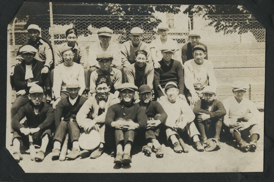Sepia toned outdoor photograph of twenty young Japanese Canadian males sitting on bleachers at a sports playing field wearing casual dress, including sweaters, newsboy caps, and baseball caps. Metal fence and trees in background.