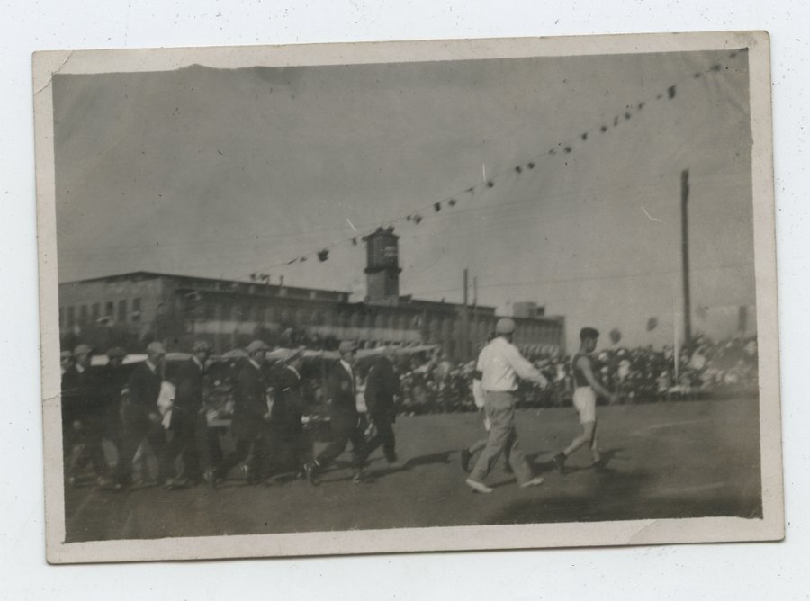 | description | Sepia toned outdoor photograph of unidentified group of Japanese Canadians walking in line at a street parade. The person leading the line is wearing a tank top and shorts. Behind him, a man is wearing a hat, long sleeve shirt, and pants. Following him are a group of people wearing full suits with hats. There is a large crowd along the sidelines of the street, power lines, and a large brick building in the background. |