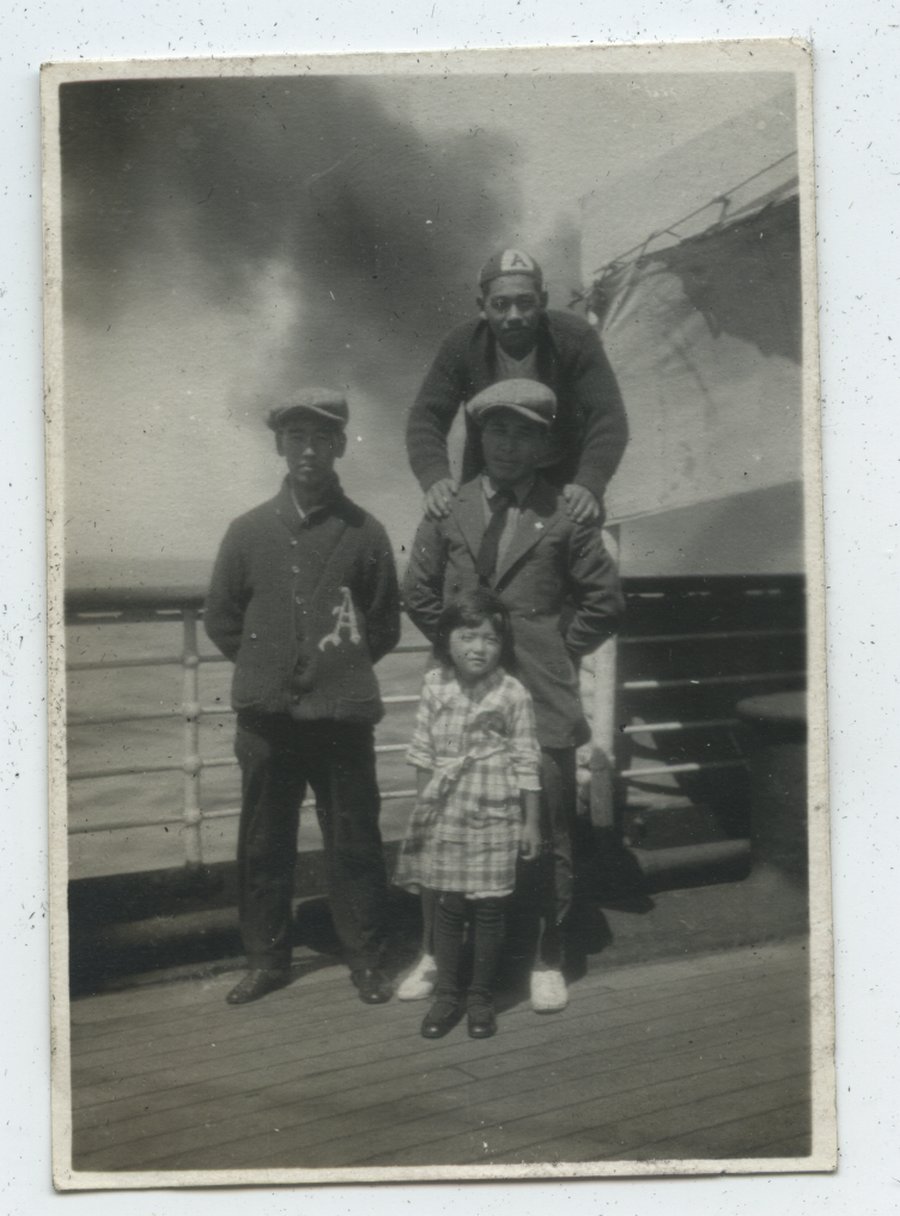| description | Black & white outdoor photograph of two Asahi baseball team members with an unidentified Japanese Canadian man and young girl on board [SS Kashima Maru]. They are standing on a wood deck with a metal railing and the ocean horizon in the background. The three men are wearing hats. The young man on the left is wearing an Asahi baseball team sweater. The young girl is wearing a plaid dress. The man behind her is wearing a full suit and tie, with hands behind his back. The young man behind him has his hands on the older man's shoulders. |