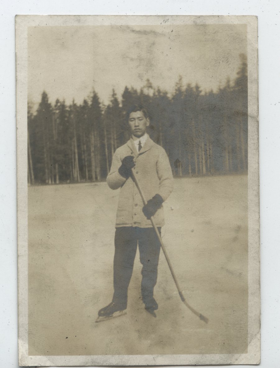 | description | Sepia toned outdoor photograph of unidentified Japanese Canadian wearing ice hockey skates, winter gloves, button up sweater, collared shirt, and tie, holding a hockey stick, standing on an outdoor ice rink with tall trees in background. Verso is annotated in pencil with "22". |