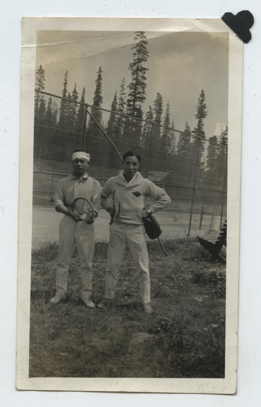 | description | Sepia toned outdoor photograph of two unidentified Japanese Canadian tennis players standing on grass in front of tennis courts wearing collared shirts, pants and holding tennis rackets. The man on the right is also wearing a head band while the one on the left is wearing a sweater with a diamond design over the left breast. Tall trees in background. Verso is annotated in pencil with "1925". |