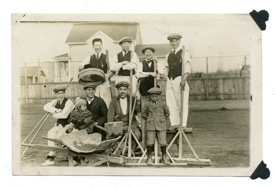 | description | Black & white outdoor photograph of nine unidentified Japanese Canadians; seven adult males and two children, with farm equipment; a grain sieve, wood bucket, wood wheelbarrow, and wood levelers. The adults are wearing formal dress; four are in collared shirts, suit vests, and white pants; one has a bow tie; two are wearing suit jackets; six are wearing newsboy caps. The two children are wearing hats; the young boy on the right is wearing pedal pusher pants and matching jacket; the young girl is seated on a man's lap wearing a wool cape, beret toque, and gloves. The group is in a farming field with wood fence and wood homes in background. Kishizo Kimura is standing in the back row first on the left. |