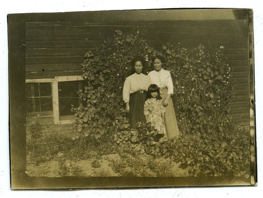 | description | Sepia toned outdoor photograph of three unidentified Japanese Canadian females; two women wearing long sleeved blouses and long skirt dresses, and one girl wearing a patterned dress. They are standing in front of a wood house with climbing plants and a window at left of photograph.