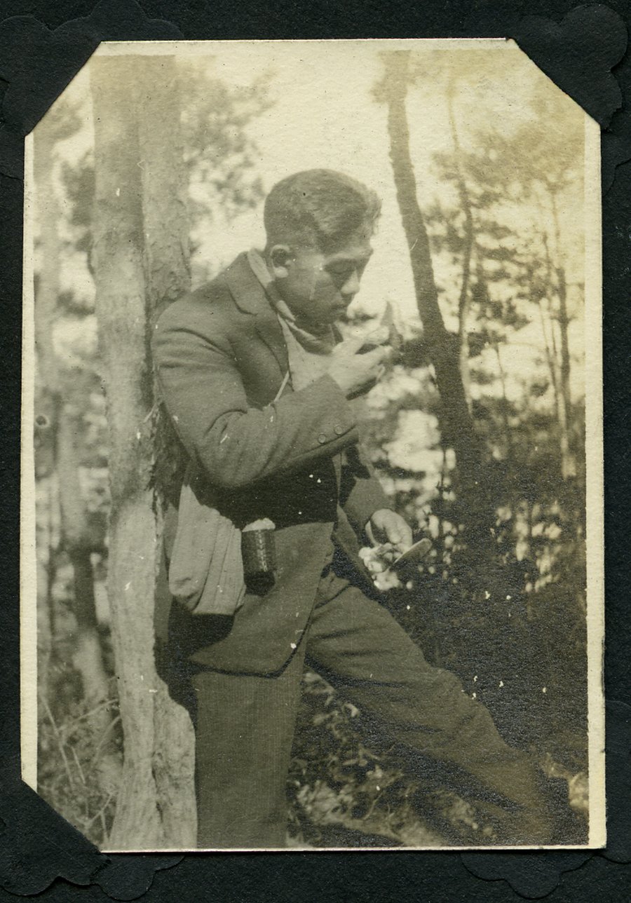 | description | Sepia toned outdoor photograph of unidentified person leaning against a tree trunk wearing a suit jacket, pants, and scarf. He is carrying a [camera lens case] over his shoulder, holding a [matsutake] mushroom in each hand; lifting his right hand up to smell one of the mushrooms. |