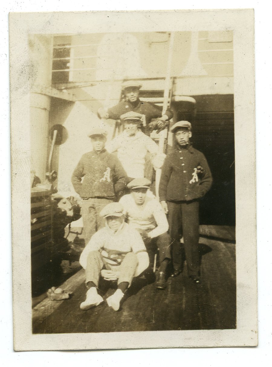 | description | Sepia toned outdoor photograph of six unidentified Asahi baseball team members on board an unidentified passenger ship [SS Kashima Maru]. They are on a wood deck with metal railing in background. Two are sitting and four are standing. Three are wearing Asahi letter "A" cardigan sweaters. They are all wearing newsboy caps. There is a baseball glove with ball on the ground. |