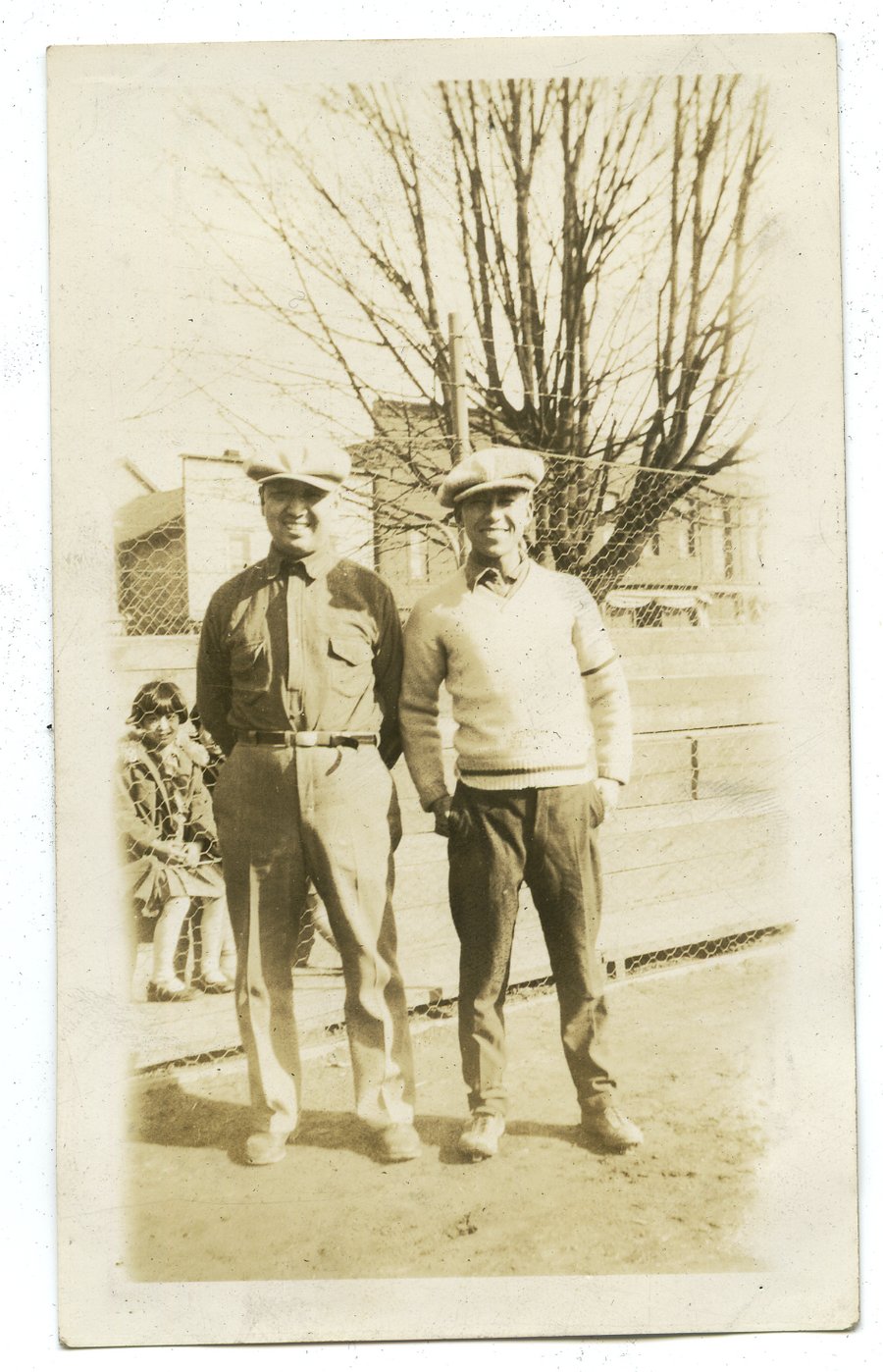 | description | Sepia toned outdoor photograph of two unidentified Japanese Canadians standing on dirt ground with wire gate and child seated on wood bleachers behind them. They are wearing collared shirts, newsboy caps, pants, and one is wearing a sweater. There is a tree, houses, and commercial buildings in the background. Verso is annotated in black pen with "March 18/28". |