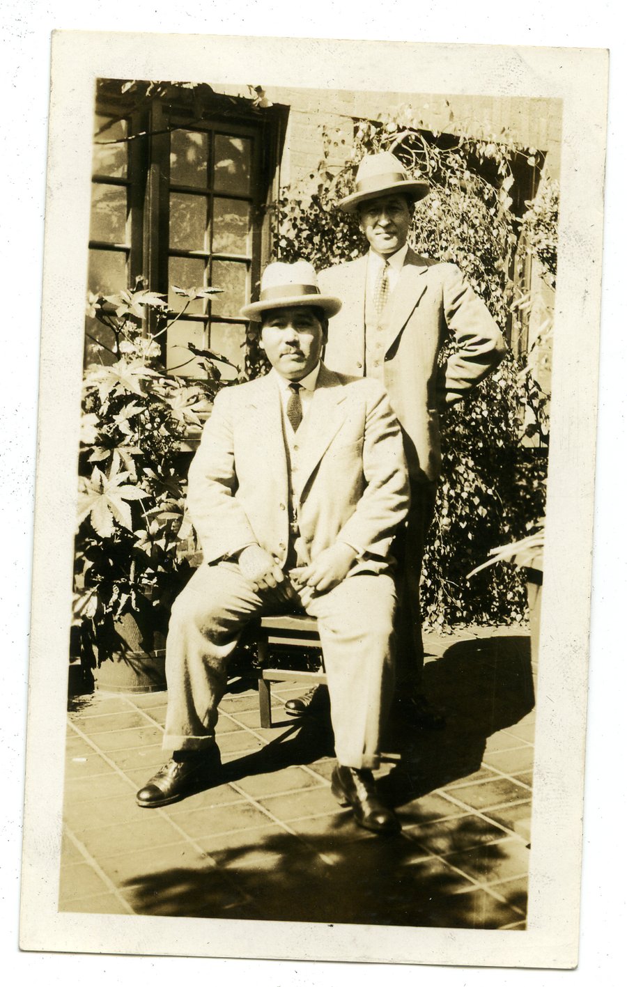 | description | Sepia toned outdoor photograph of two unidentified Japanese Canadians wearing formal dress, including full suits, ties, and dress hats, at the Hotel Vancouver Roof Garden in Vancouver, BC, in September 1929. One is seated and the other is standing behind them, on a tiled floor with plants and wood pane window of brick building in background. Album page is annotated in white pen with "Sept. 1929; TAKEN AT HOTEL VANCOUVER ROOF GARDEN". |