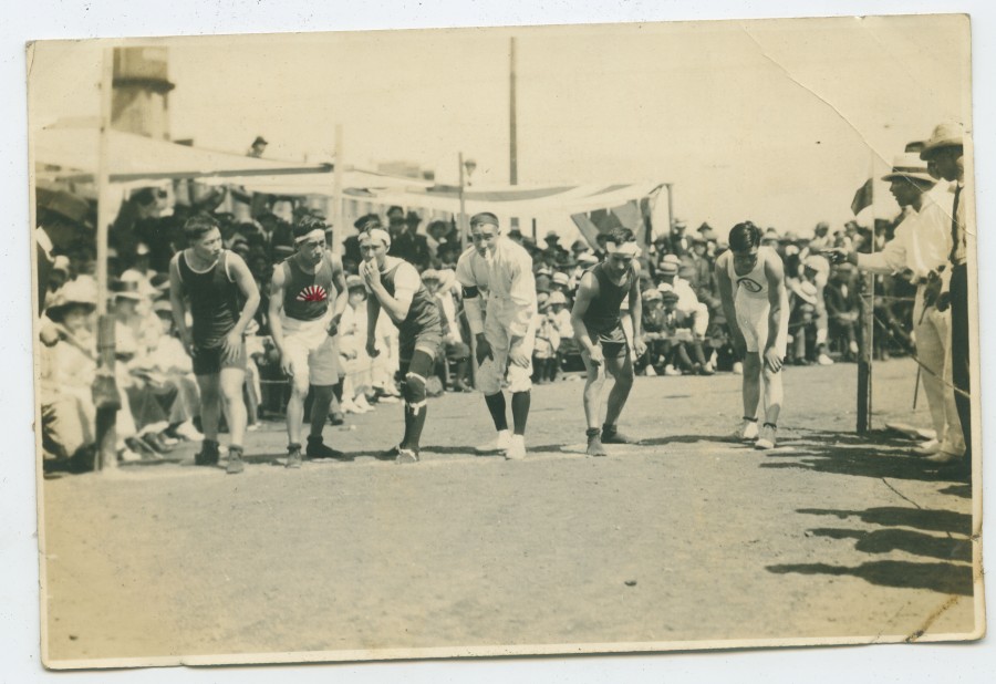 | description | Sepia toned outdoor photograph of six unidentified Japanese Canadians on July 1, 1919. They are standing in a row at a starting line in preparation for a foot race, wearing athletic clothing; five are wearing tank tops and shorts; one is wearing a collared shirt and knickerbockers. A crowd of people are seated and standing behind them, some from under tents. Recto is decorated in red pen to highlight the rising sun design of an Asahi baseball team members' tank top. |