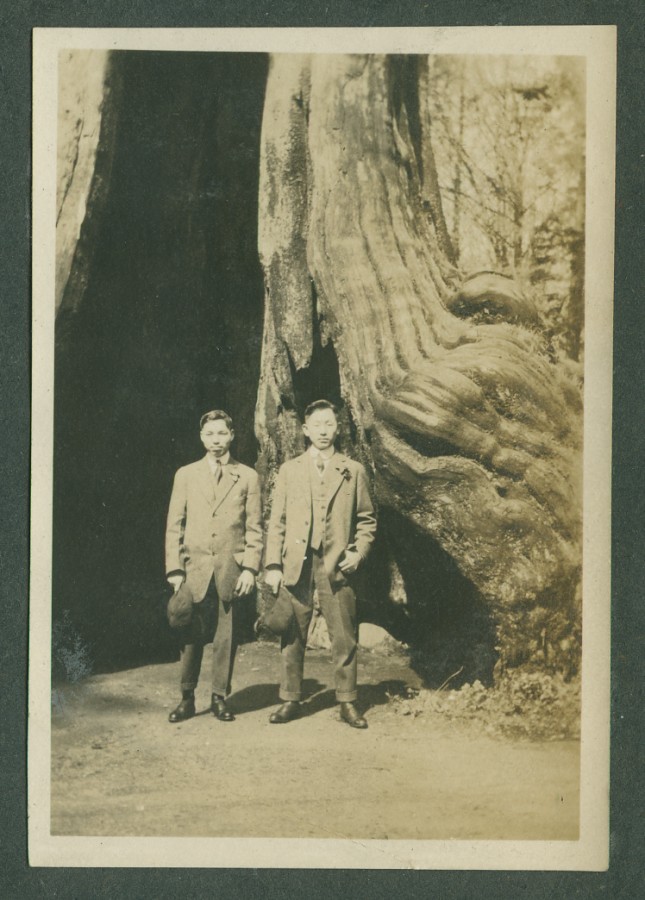 Two unidentified Japanese Canadians at the Hollow Tree in Stanley Park; Vancouver, BC; [ca.1920]