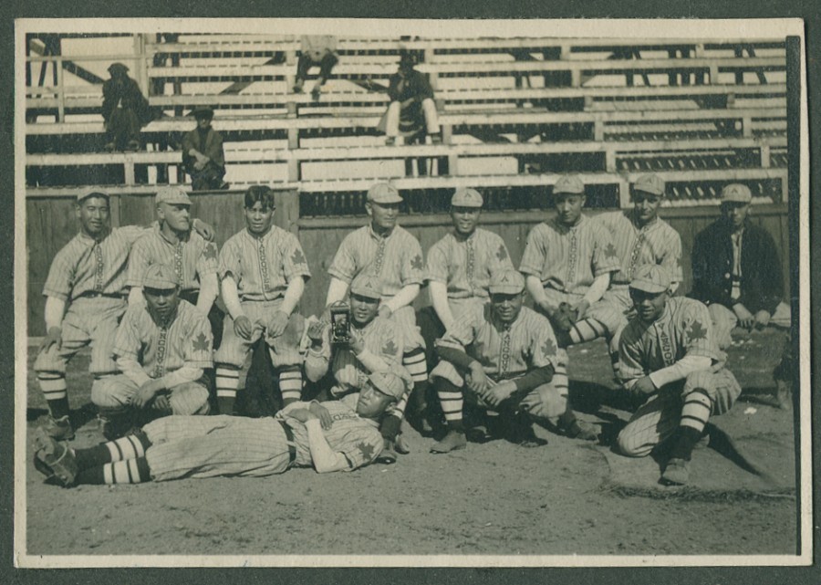 | description | Black & white outdoor photograph of thirteen unidentified Asahi baseball team members wearing full team uniform; eight sitting on the bench, four kneeling in front of the bench, one laying on the ground in front of the bench; and four unidentified persons on bleachers at [Shibaura Ground, Tokyo, Japan], [c.1921]. One of the players at the centre of photograph is holding a camera. Album page is annotated in black pen with "AFTER PRACTICE". |