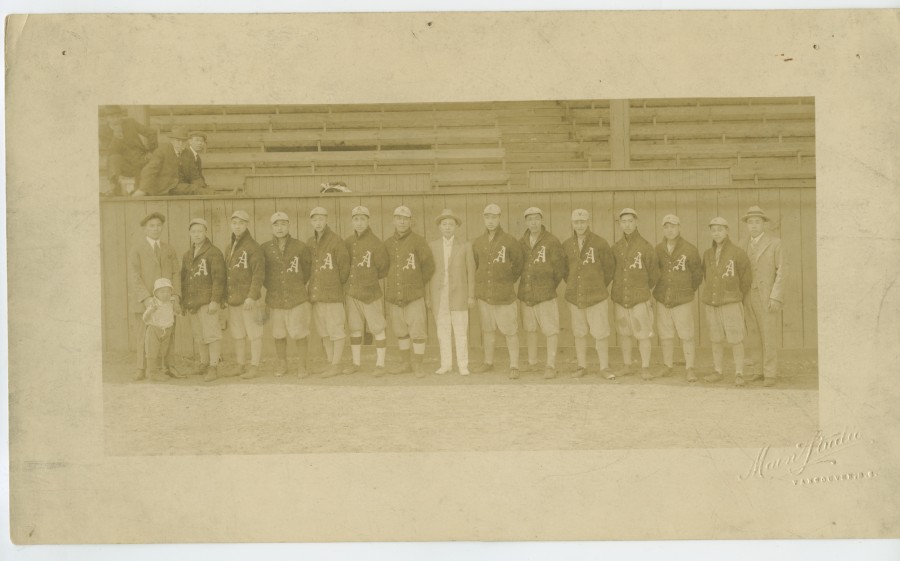 | description | Sepia toned outdoor group photograph of fifteen Japanese Canadian adults and one child, standing in a line, in front of wood fence separating playing field from bleachers, with wood bleachers in background; there are also three persons sitting in bleachers at left of photograph wearing full suits, ties, and dress hats. At far left, man with child is wearing full suit and tie, with newsboy cap, hands on child's shoulders; child is wearing a collared shirt, pants, and bucket hat; next to them are six Asahi baseball team members wearing knit button up sweaters with "letter A" on left side of chest, "letter A" baseball caps, and knickerbockers; at centre, there is a person wearing a white collared shirt, pants, and tie, light coloured jacket, and dress hat; next are six more Asahi baseball team members wearing knit button up sweaters with "letter A" on left side of chest, "letter A" baseball caps, and knickerbockers; at far right is a man wearing a light coloured full suit and tie, with dress hat. Item is embossed with "Main Studio; VANCOUVER, B.C." Verso is annotated in pen with "E. Kitagawa" and "Taken June 15th 1919 at Athletic Park, Vancouver B.C."
