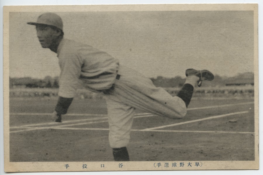 | description | Black & white outdoor photograph of an unidentified baseball player, gesturing as though he has just thrown a ball, with left leg kicked up behind him, in a baseball playing field, with other players in the background. The player is wearing a baseball uniform, with cap. Photograph is captioned in Japanese text. Verso is printed with "UNION POSTALE UNIVERSELLE; CARTE POSTALE" and with Japanese text. |