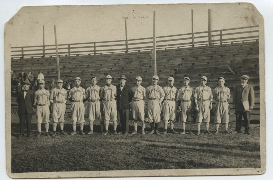| description | Sepia toned outdoor group photograph of fourteen Asahi baseball team members; including eleven players in team uniforms with "ASAHI" jerseys and "letter A" baseball caps; two men, standing at opposite ends of group, wearing full suits, with newsboy caps; and one, at centre, wearing button up knit sweater, suit pants, collared shirt, bow tie, and a dress hat. The group is standing on grass in a playing field, with wood bleachers in background, and around ten other figures sitting among the bleachers. Verso is annotated in pencil with "Eddy" and in pen with "Taken on August 15th 1918; E. Kitagawa" and stamped in ink with "352 Wolverleigh Boulevard, Toronto 360, Ontario". |