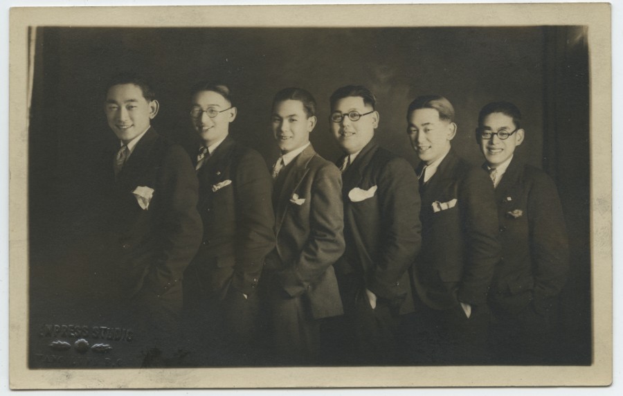| description | Sepia toned studio group portrait photograph of six young Japanese Canadian men wearing full suits and ties, standing in a row, with hands in pockets; three of the six are also wearing glasses. Identified from left to right are: Satoshi "Sally" Nakamura, unidentified, unidentified, Harry Kumano, Frank Nakamura, and unidentified. Photograph is embossed with "EMPRESS STUDIO; VANCOUVER, B.C." |