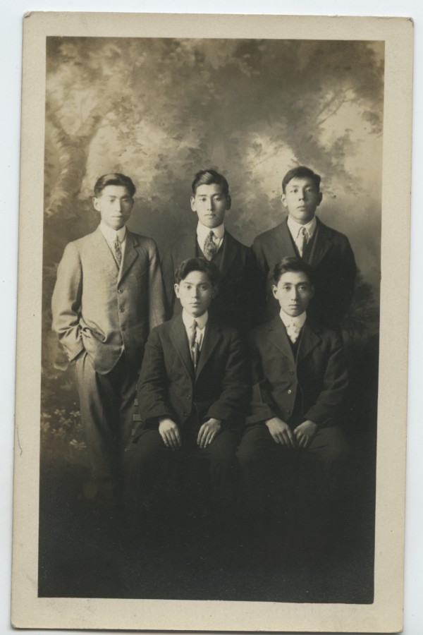 | description | Sepia toned studio group portrait photograph of five unidentified persons wearing full suits and ties. Two of the five are seated on a wood bench; three are standing behind the bench. There is a whimsically painted landscape of clouds, flowers, and trees, in the background. |