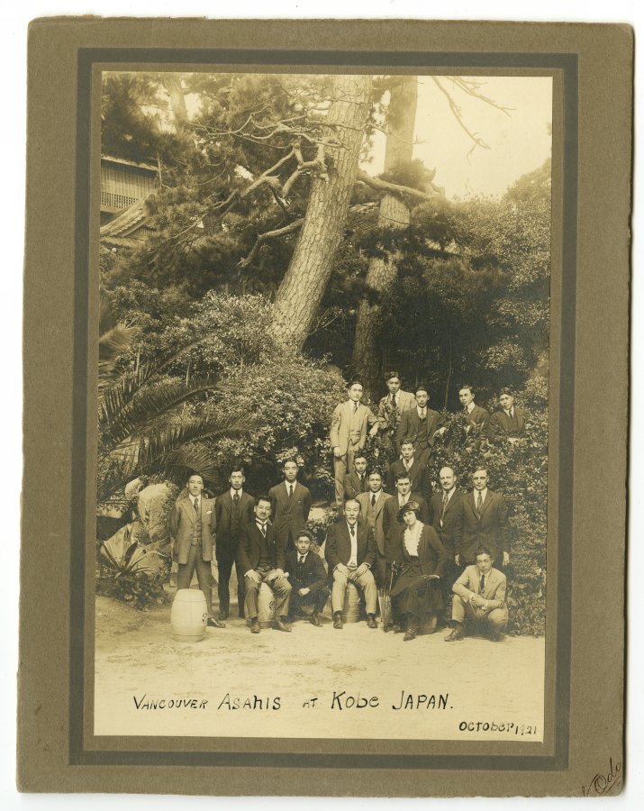 Recto of photograph is annotated with "Vancouver Asahis at Kobe Japan. October 1921". Verso of card stock frame is printed with Japanese text, and annotated in pen with "E. Kitagawa", "1 COPY", and "P59", as well as stamped in ink with "352 Wolverleigh Boulevard; Toronto 360, Ontario". |