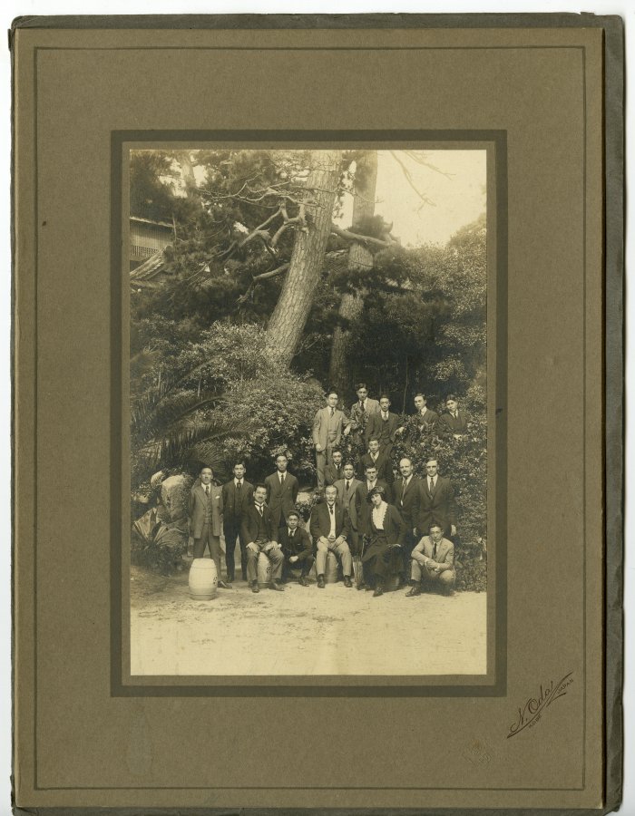| description | Sepia toned outdoor group photograph of nineteen people among plants and large trees, with a traditional Japanese building in the background. There are eighteen men wearing full suits with neck ties, and one woman wearing a skirt and blouse with a long dress jacket, hat and and gloves. The woman and two of the men are sitting on barrels while two other men crouch near them, and the rest of the group is standing.