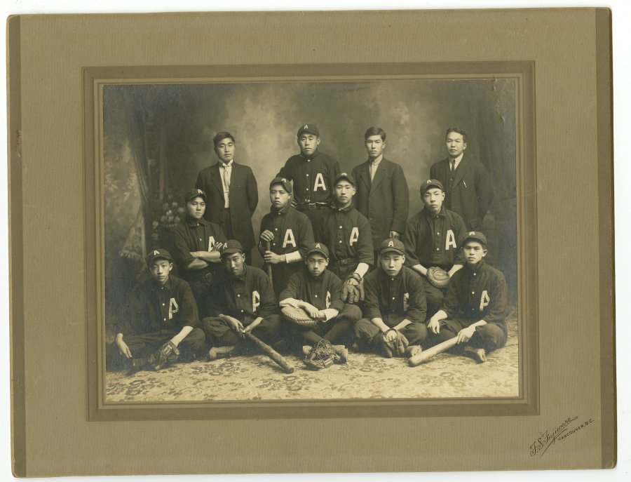Card stock frame is printed with "F.S. Fujiwara; Vancouver, B.C." and verso is annotated in pen with "Taken October 3rd, 1915; Vancouver Asahi B. Club; Vancouver, B.C."