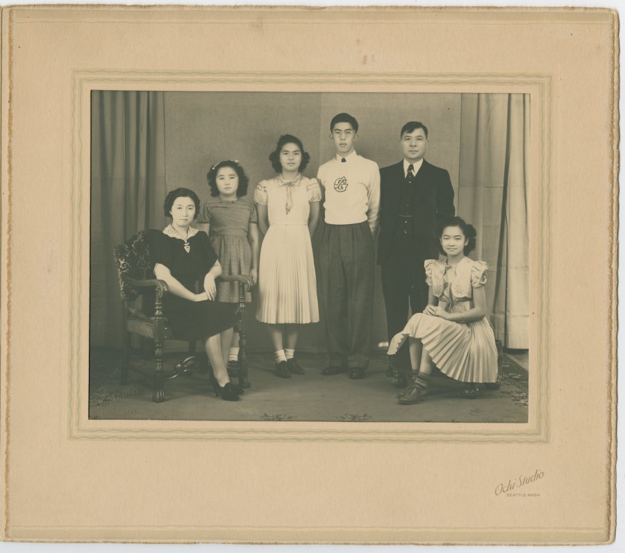 | description | Black & white indoor studio photograph of a family of six. From right to left: a woman seated in an upholstered wooden arm chair, wearing a lace collared short sleeved blouse and skirt or dress, heeled dress shoes, and a wedding ring on her left middle finger; a young girl wearing a short sleeved dress, socks, a bracelet on her left wrist, and bows in her hair; a young woman wearing a short sleeved dress with a pleated skirt, and a ribbon tie at the neck, socks, and lace-up shoes; a young man wearing eye glasses, a collared shirt with neck tie, sweatshirt with logo design featuring the letter "G" and a music note, tweed trousers, and dress shoes; a man wearing full suit with vest, collared shirt, neck tie, dress shoes, and a vest chain; and a girl seated on an upholstered foot rest, wearing a short sleeved dress with pleated skirt, shoulder coverlet with floral design, striped socks, and lace-up shoes. There are two fabric curtains hanging on both sides of the family and a decorative rug beneath them. The photograph is embossed at bottom left corner with "Ochi Studio; Seattle, Wash." The card stock frame is printed at bottom right corner with "Ochi Studio; Seattle, Wash."