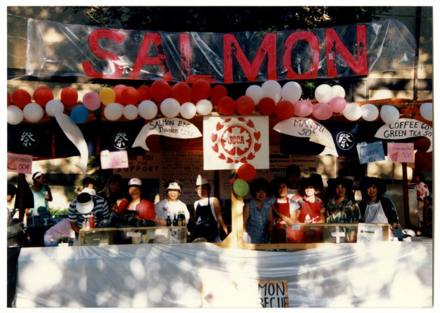 | description | An image of the front of a food booth, behind which eleven people are posing. From left to right there is a man with a white visor mid-bow, a woman obscured by shadow, a woman in a white hat and black apron, a woman in a white hat, a woman in a white hat and black apron, a woman in a blue dress, two women in red aprons, a man obscured by shadow, a woman wearing a turquoise shirt, and a woman wearing a white apron. The front of the booth is covered by a white tarp, on which is a sign that says "Salmon Barbecue." Hanging from the roof of the booth are signs that say "Watermelon 50¢," "Cukes $1.00, "Salmon BBQ Dinner $3.95," "JCCA," "Manju 50¢," and "Coffee 60¢, Green Tea 50¢." More menu signs are on the wall of the booth behind the people, including one that says "Thank you for the Support." On top of the booth are dozens of colourful balloons, and a large sign that says "SALMON." |