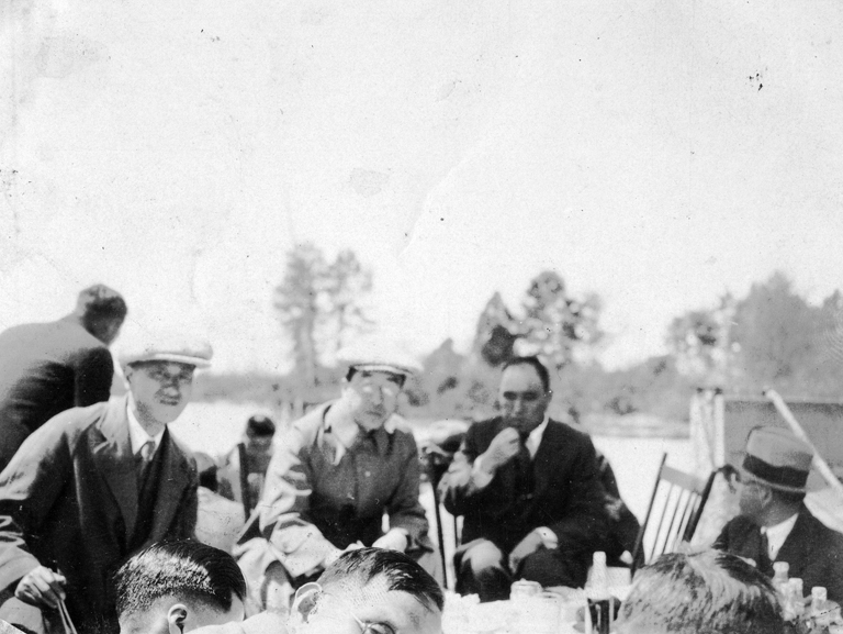 | description | The blurry image shows eight Japanese men wearing suits, some with hats, eating outside. Three of the men have their faces cut off by the camera. In the background is a body of water, land and trees.