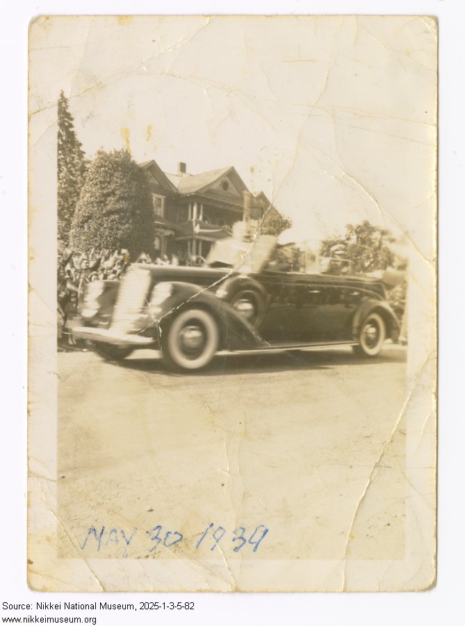 | description | This item is a black and white photographic print of a car, an open Packard convertible, driving or parked on a street. The date on the recto, May 30, 1939, is likely inaccurate. There is writing in Japanese on the verso of the developed photograph dating it to May 31, 1939, the day of the royal visit by King George VI and Queen Elizabeth in New Westminster, BC. The handwritten description also states the Japanese Canadian community (translated: "Japanese compatriots") in New Westminster participated in the welcoming of the monarchs from the United Kingdom.
