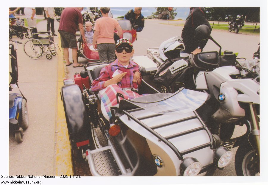 This item is a colour photograph of Atsushi Uyeda sitting in the sidecar of a motorcycle at a rally put on by the Bee Cee Beemers Motorcycle Club in Nakusp, BC, taken in 2017.