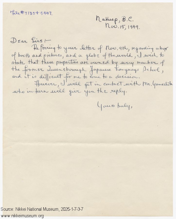 | description | Item is a handwritten copy of a letter, likely written by Yonezo Uyeda, replying to the letter sent to Yonezo by W.J. Johnston of the Japanese Evacuation Section of the Office of the Custodian of the Department of the Secretary of State of Canada on November 9, 1949 (2025.1.7.3.5). The letter is handwritten in English and dated November 15, 1949, sent from Nakusp, BC, and is unsigned. The letter states that Yonezo is having difficulty giving permission for the return of items dispossessed from the former Queensborough Japanese Language School given that they belonged to the entire membership of the school. Yonezo indicates that he will get in touch with Mr. Yamashita (referring to Mr. Mitsuga Yamashita in the letter from the Office of the Custodian).