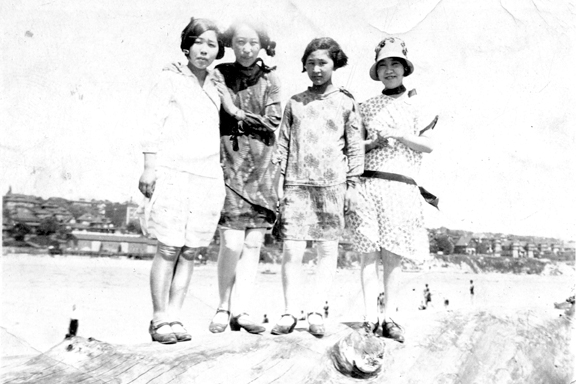 | description | The image shows four unidentified young women in patterned dresses and light coloured stockings standing on a log at a beach. In the distance in the right section of the photograph, other people in bathing suits are visible at the beach. Across the waterway, buildings and trees are visible on a hill. |